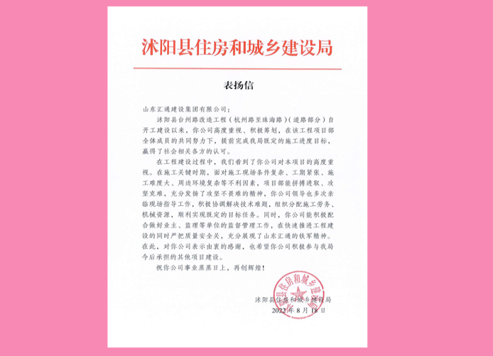 近日,沭陽縣住房和城鄉(xiāng)建設(shè)局向匯通公司發(fā)來表揚(yáng)信,對(duì)沭陽縣臺(tái)州路改造工程項(xiàng)目部面對(duì)工期緊、管線障礙多、周邊環(huán)境復(fù)雜等不利因素,科學(xué)調(diào)度周密組織,嚴(yán)把工程質(zhì)量安全關(guān),提前完成進(jìn)度目標(biāo)給予高度肯定。
