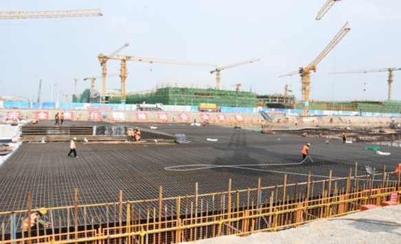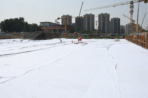 他力薦新工藝應(yīng)用,對于大體積混凝土的養(yǎng)護工作,初期養(yǎng)護內(nèi)外溫差大,不宜灑水養(yǎng)護。項目部采用新式水能量膜養(yǎng)護+土工布保溫的方式,同時布置測溫點實時監(jiān)控砼內(nèi)外溫度,使養(yǎng)護工作得以量化,用數(shù)據(jù)說話,及時分析砼內(nèi)外偏差原因,適度調(diào)整,確保主體混凝土質(zhì)量。(混凝土節(jié)水保濕養(yǎng)護膜是以新型可控高分子吸水材料為核心,以塑料薄膜為載體,通過設(shè)備加工復合而成的卷材產(chǎn)品。其中高分子材料可吸收自重200倍的水分,吸水膨脹后變成透明的晶體狀,把液態(tài)水變成固態(tài)水,每平方米養(yǎng)護膜可蓄水0.5KG,成為一個固態(tài)的微型水庫,然后通過毛細管的作用向混凝土養(yǎng)護面滲透,同時不斷吸收混凝土在水化熱過程中產(chǎn)生的蒸發(fā)水,因此在一個養(yǎng)護期內(nèi)總能保持混凝土表面濕潤。)