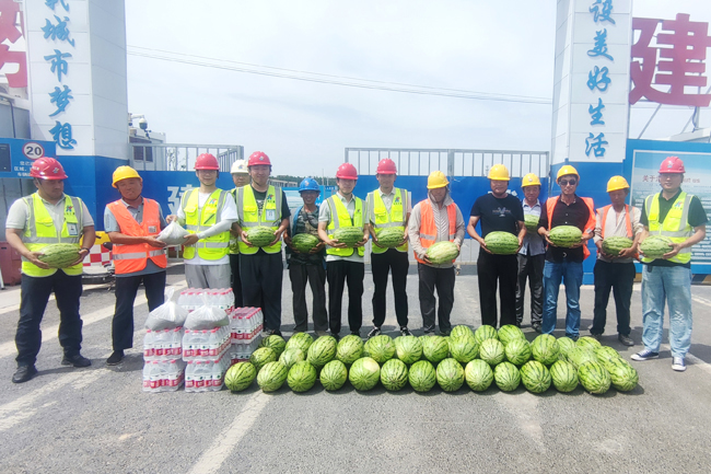 烈日炎炎、驕陽(yáng)似火,進(jìn)入7月以來(lái),連續(xù)多日發(fā)布高溫橙色預(yù)警,為做好高溫期間安全生產(chǎn)工作,保障現(xiàn)場(chǎng)施工安全,匯通集團(tuán)分會(huì)組織開展“夏送清涼”慰問一線活動(dòng),深入工地、走近工友,把清涼送到施工一線、把關(guān)懷送到職工心坎里。 7月6日,分管經(jīng)理袁鵬、綜合辦公室主任馬婕帶領(lǐng)匯通集團(tuán)分會(huì)小組走進(jìn)項(xiàng)目部,開展“夏送清涼”慰問一線活動(dòng),為每個(gè)施工班組送上清熱解渴的礦泉水、西瓜、綠豆等防暑降溫物資,對(duì)炎炎夏日奮戰(zhàn)在一線的廣大職工及勞務(wù)人員表示親切慰問,叮囑一線人員要保證人身安全,適當(dāng)科學(xué)合理安排作息時(shí)間,根據(jù)氣溫情況,避開高溫時(shí)段,切實(shí)做好防暑降溫工作,同時(shí)要求各施工隊(duì)伍堅(jiān)持“安全高于一切、質(zhì)量重于泰山”理