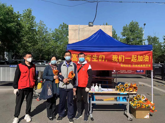 “高三考生們,我們一起加油!” 在領(lǐng)秀城秀柏社區(qū)的防疫志愿服務(wù)站,一條大紅色的條幅,一朵朵象征著太陽與光明、生機與活力的太陽花在陽光的照射下格外絢爛醒目。今天是五一勞動節(jié)也是高三考生因疫情封閉后第一天復(fù)課的日子。 在這個特別的節(jié)日里,領(lǐng)秀城秀柏社區(qū)的防疫先鋒隊第一小組組長榮峰提前一天就定購好了100朵鮮花,一大早,當(dāng)高三學(xué)生走到小區(qū)門口,志愿者們就將一朵朵鮮艷的太陽花和祝??ㄋ偷綄W(xué)生手中,“想起了向日葵就想起了陽光,微笑和美好常在,我們一起加油!” “叔叔,太謝謝你們了,你們在加班加點為我們服務(wù),還給我們送花,真是讓我倍受鼓舞?!薄疤兄x你們了,謝謝志愿者們這些日子以來對我們